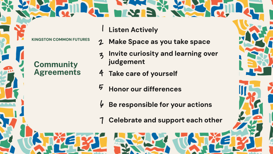 One useful tool is Community Agreements. You can download a PDF of them here. Kingston Common Futures has developed our community agreements based on our values and the Working Agreements of the original Design Team. We currently have seven agreements: